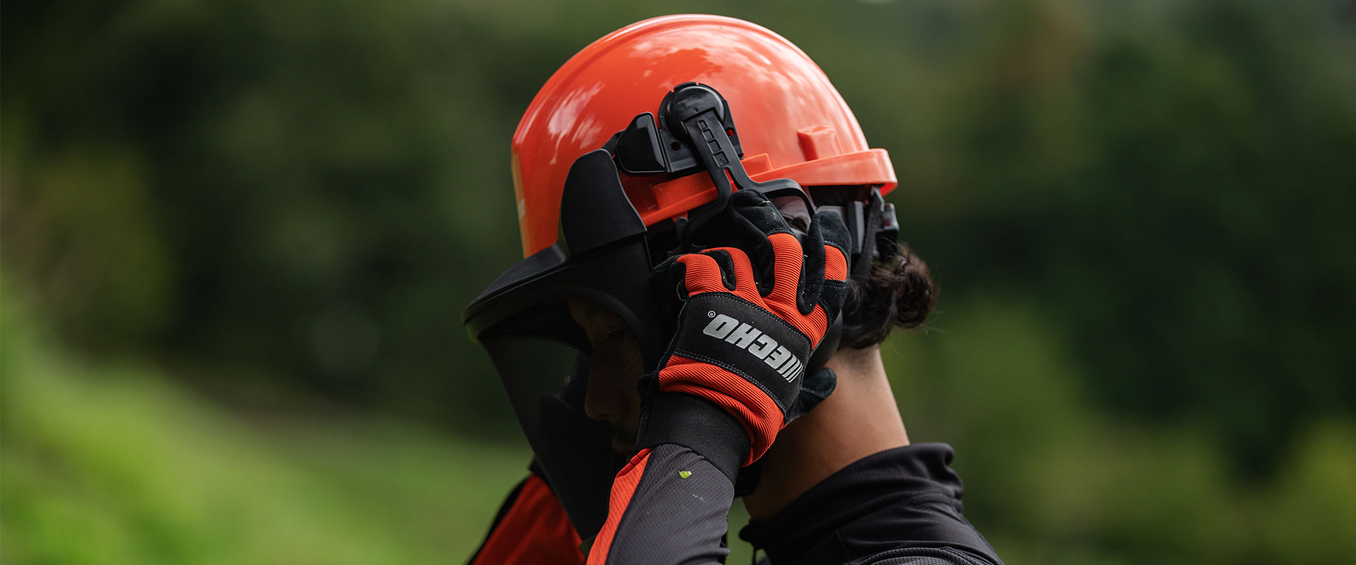 Built for ultimate safety. The ECHO multi-purpose helmet features a hard hat with a six-point ratching system to adjust size. Internal cushioning for comfort, a mesh pull-down visor and ear protection.